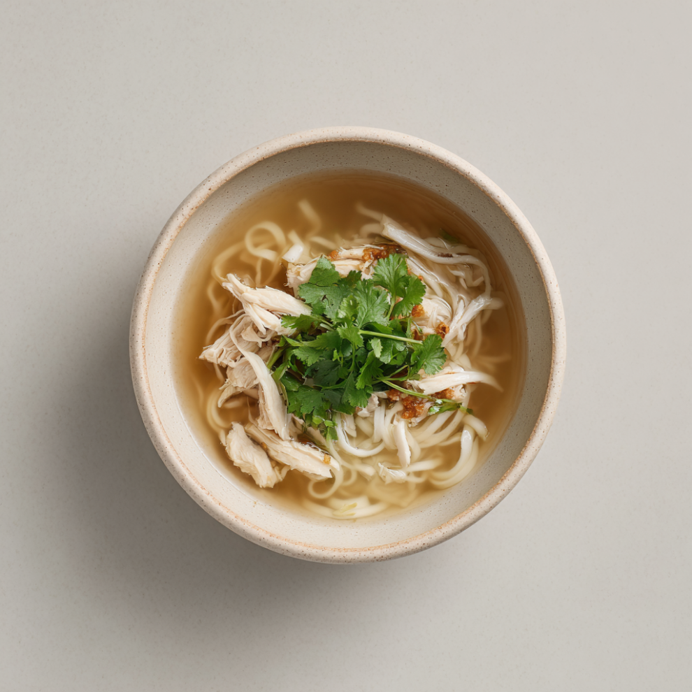 Куриный бульон с филе куриного бедра, яичная лапша и половинка отварного яйца. Сервируем мелкорубленной петрушкой и оливковым маслом.